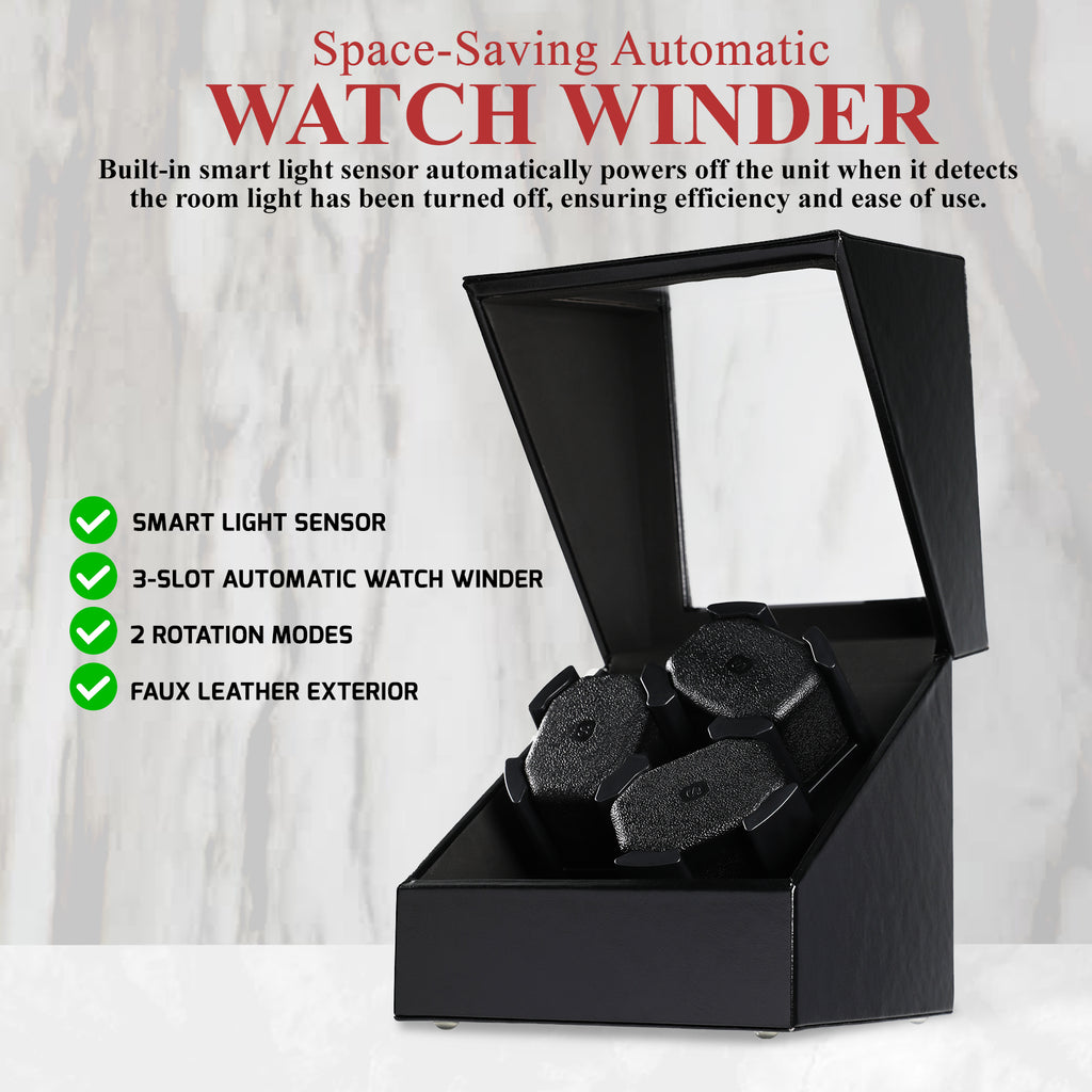WWR-533 Automatic Watch Winder for 3 Watches, Whisper Quiet Motor with Smart Light Sensor, 2 Rotation Modes, Memory Foam Cushions, Automatic Rotating Watch Winder Faux Leather Exterior