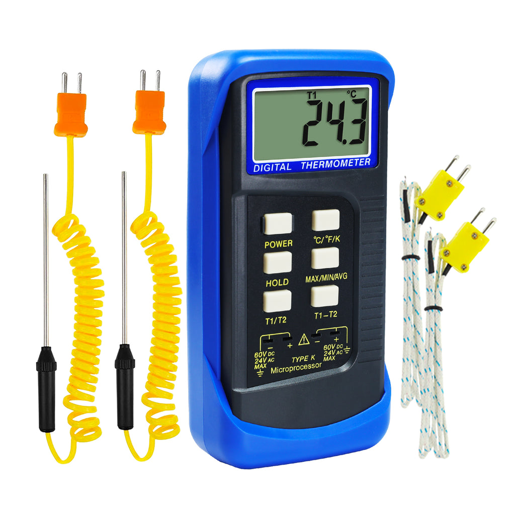 A professional digital thermometer is designed to work with 2 external K-Type thermocouples for high-temperature measurement. Display high-temperature range from -50 ~ 1300°C (-58 ~ 2372°F). It comes with built-in microcontroller software and the dual thermocouple input terminals enable simultaneous measurement of two samples.